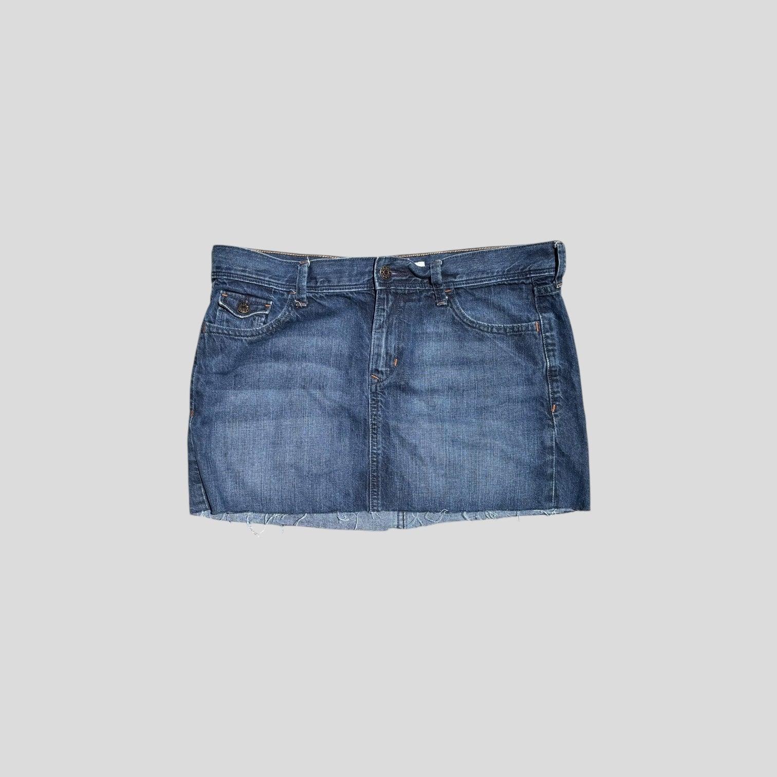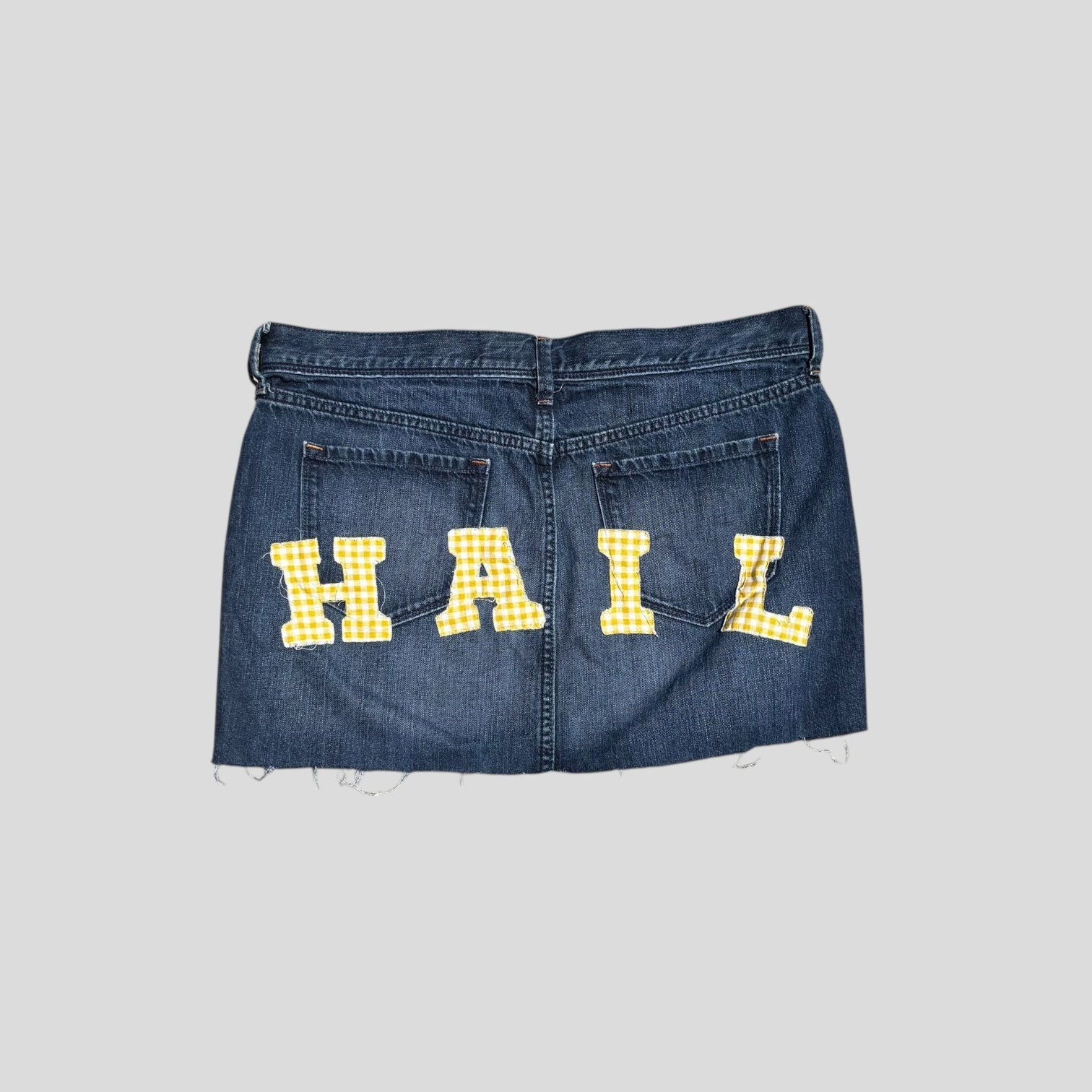 Product: Super cute jean skirt with "hail" on butt! Raw edge.
