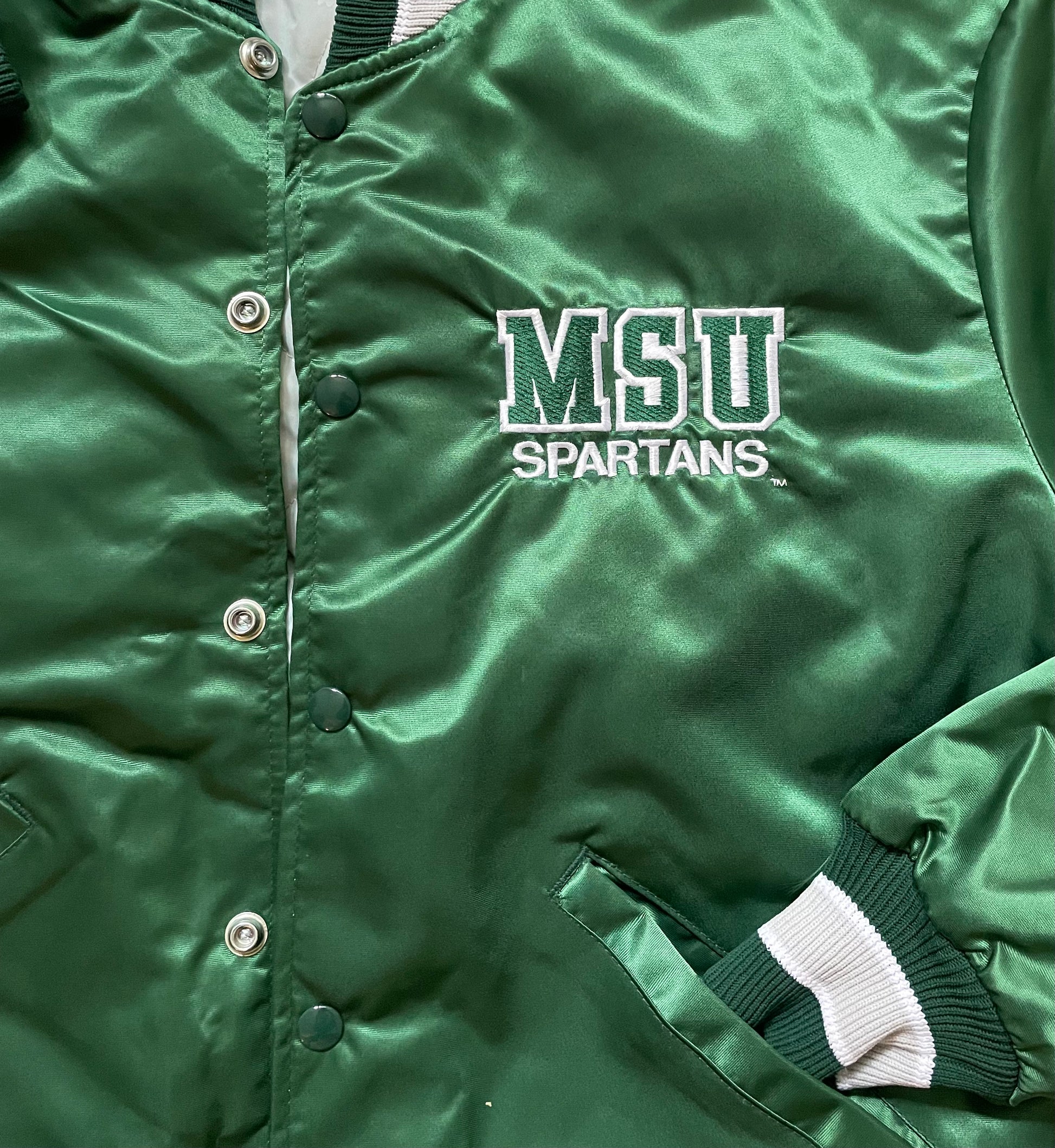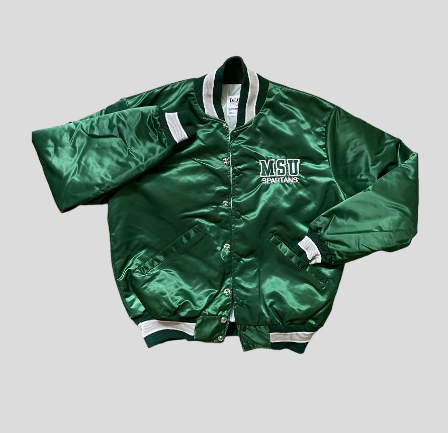 Product: 1980s MSU green satin bomber jacket with quilted interior and patch logo and pockets