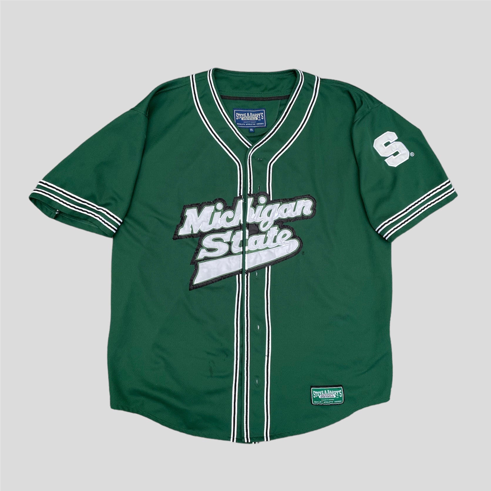 Product: Vintage Baseball jersey with Michigan State Lettering across the buttons, and Block S on the sleeve