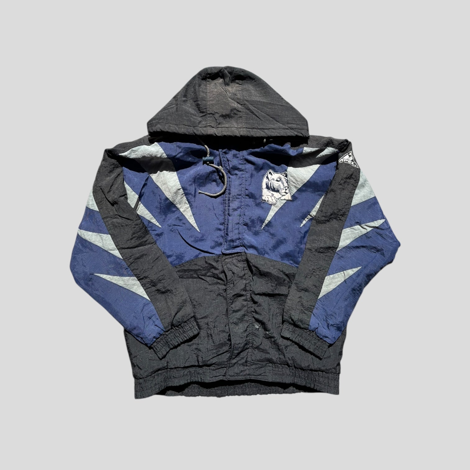 Condition: Worn, ZIPPER IS BROKEN! Still buttons up just fine. Small flaw on black section of coat!